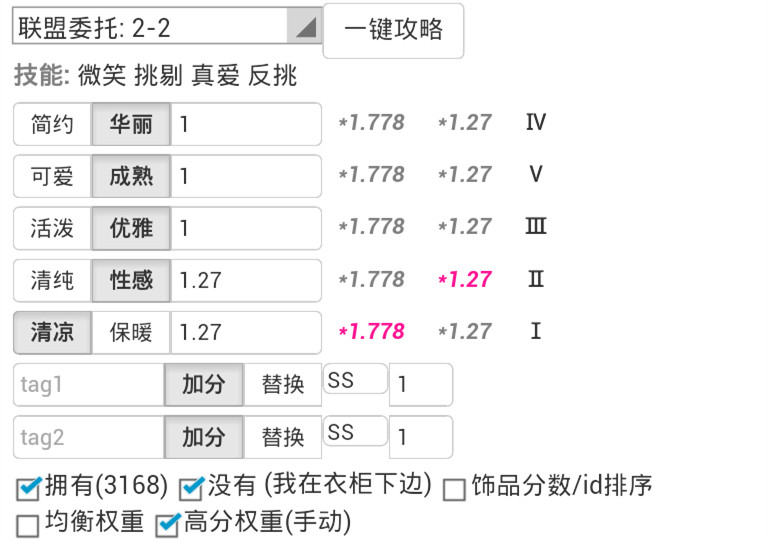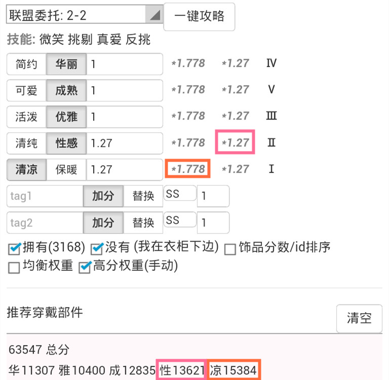 3.6.3.3.在得分最高的属性上,分别计算加分技能加成(*1.778为微笑、飞吻叠加的加成,*1.27为微笑的加成。)